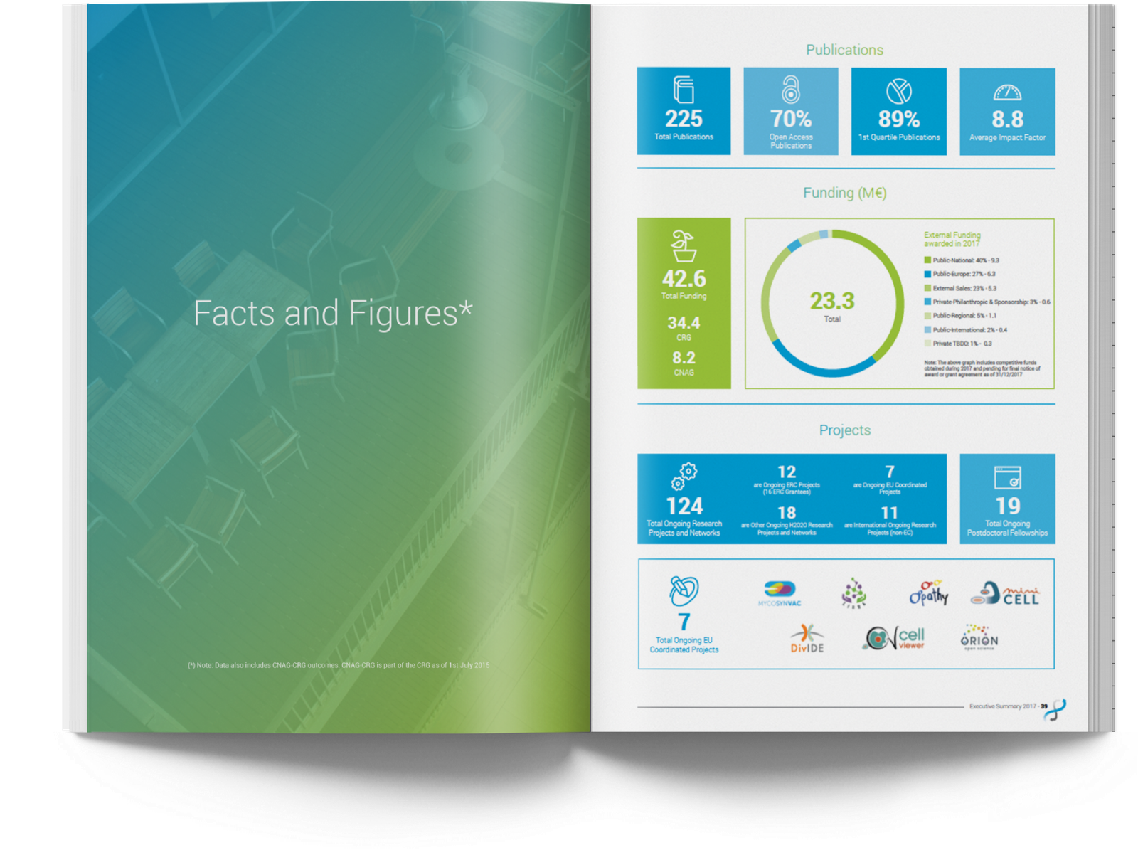 El CRG continúa apostando por el Annual Report como pieza clave en su estrategia de comunicación a nivel internacional. Un año más, pensamos la manera de aportar exclusividad a nuestro cliente. El tratamiento de las imágenes, y un código cromático nuevo, amplían los límites de la misma identidad visual, aportando innovación y diferenciación.