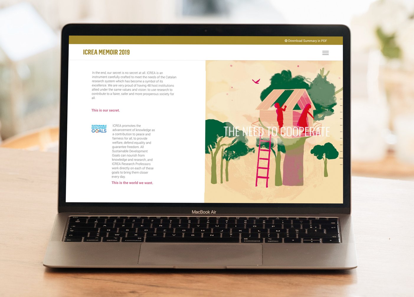Creatividad y diseño de la memoria anual para diferentes canales y soportes, en la que hemos trabajado con especial esmero las ilustraciones que reflejan los valores de la marca.