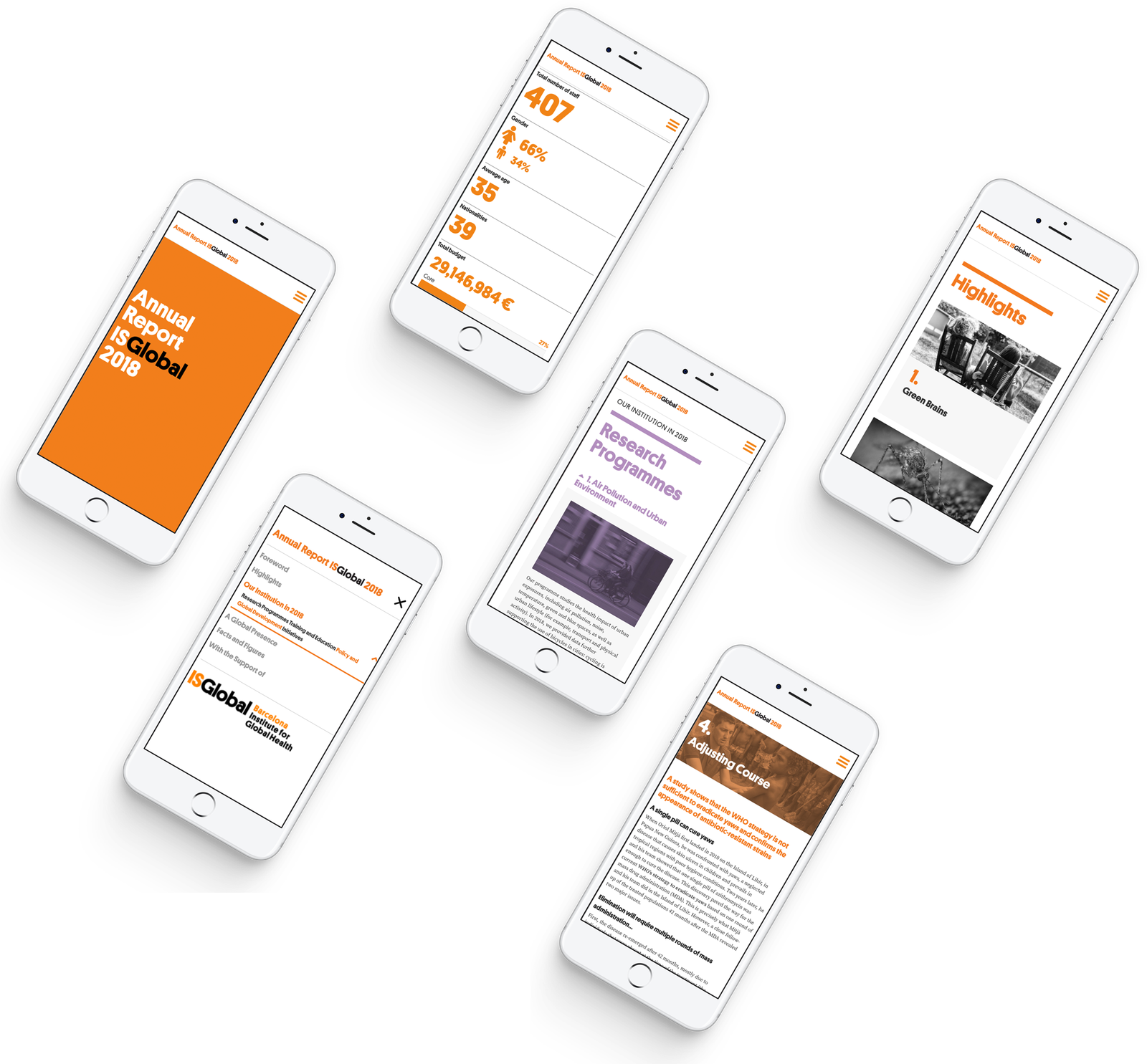 Diseño y desarrollo de la memoria anual (online e impresa) para el ISGlobal, donde hemos querido plasmar su carácter único como centro de excelencia en investigación científica.